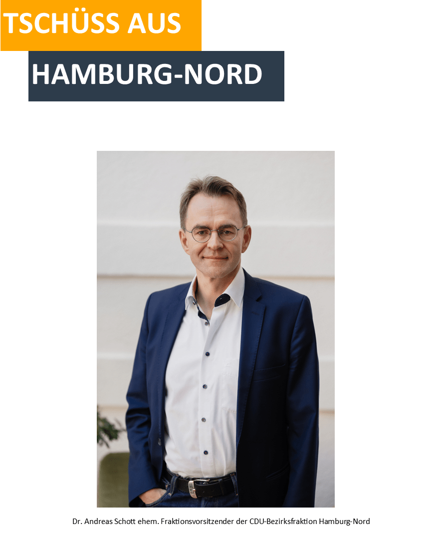 Nach sieben Legislaturperioden, 280 Bezirksversammlungen, einem halben Dutzend Bezirksamtsleiter und über 20 Jahren als Fraktionsvorsitzender der CDU-Fraktion in der Bezirksversammlung Hamburg-Nord, verabschiedete sich Dr. Andreas Schott auf eigenen Wunsch aus der Fraktion und der aktiven Bezirkspolitik. Der Schritt war langfristig geplant. Bereits 2024 wurde Martin Fischer zum neuen Fraktionschef gewählt.